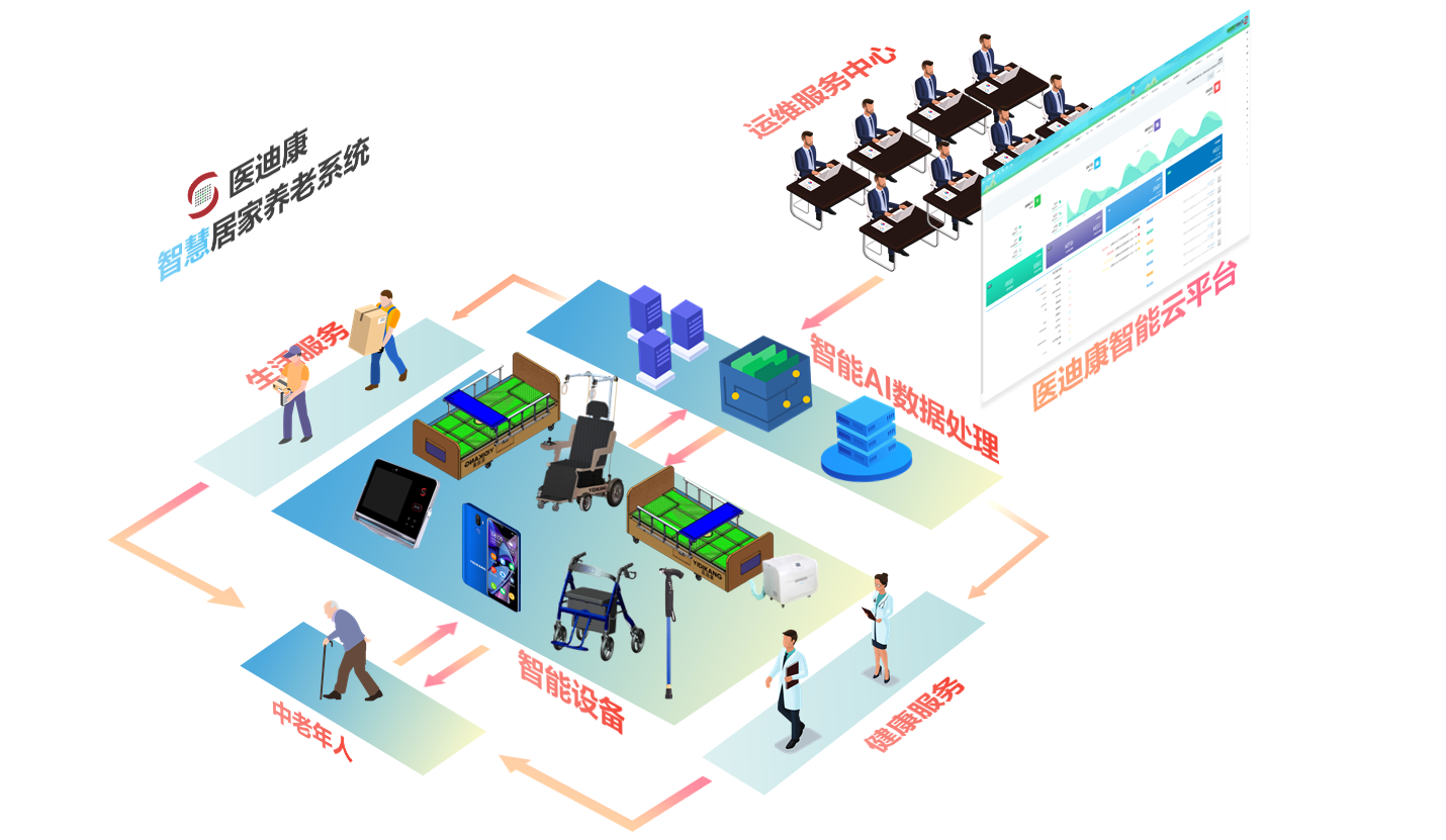 医迪康智慧养老平台以“数字驱动健康,智慧赋能养老”为愿景,以医护康养一体化的养老模式,实现“医、护、康、养”四位一体的综合性服务模式和服务体系 。以大数据为依托,优化医养供需配置,增强服务精准性和有效性,实现医养结合数字化生态体系。其中智能硬件、医疗服务、大数据平台成为养老质量的关键因数。覆盖了数字化渠道与销售、业务流程标准化与智慧化运营、大数据决策、养老运营监管等全业务,满足居家为主、社区为辅的医养结合模式的需求。为健康养老行赋能。